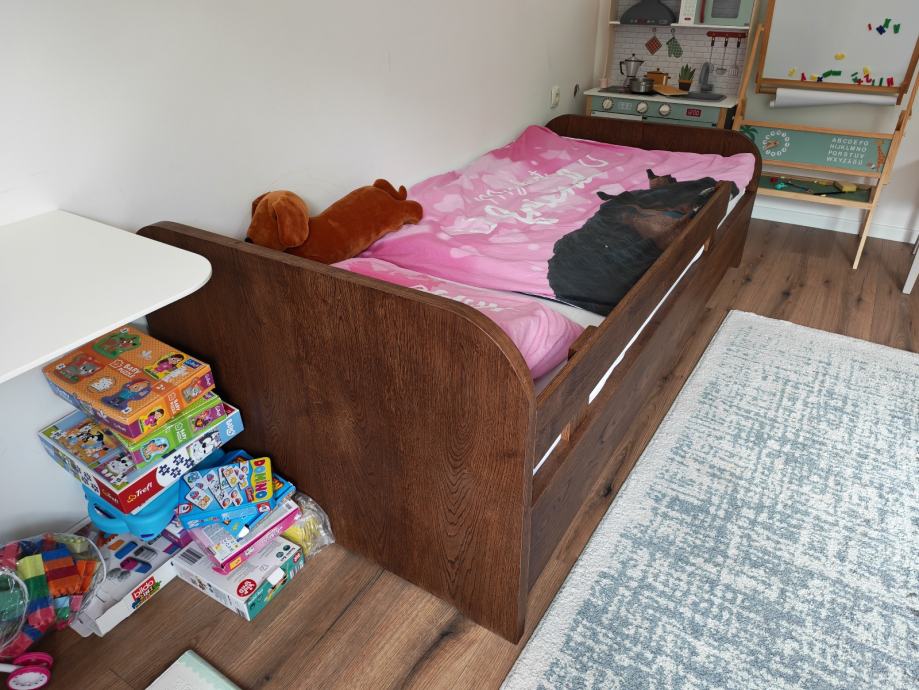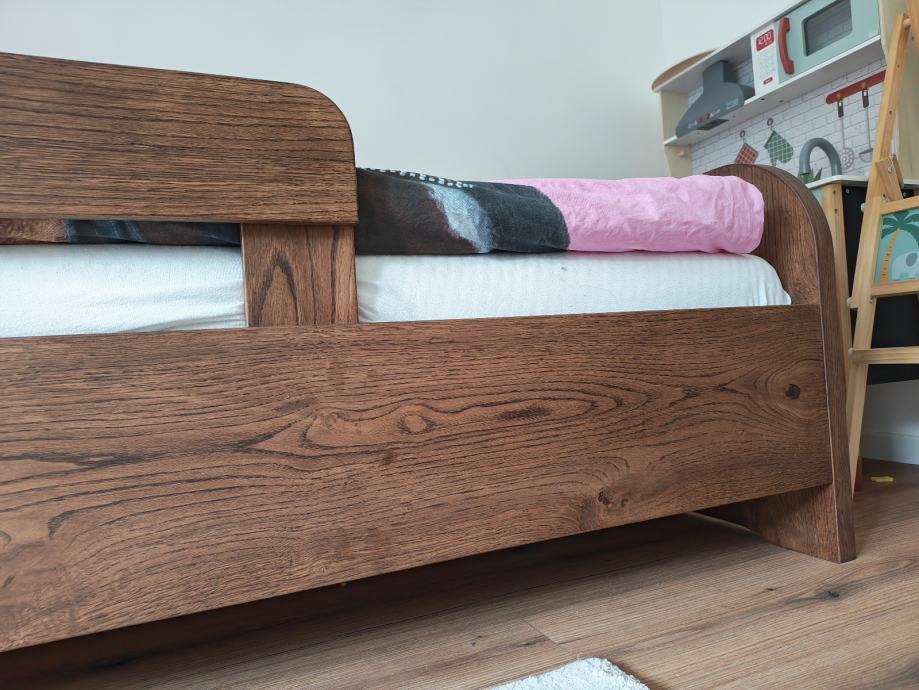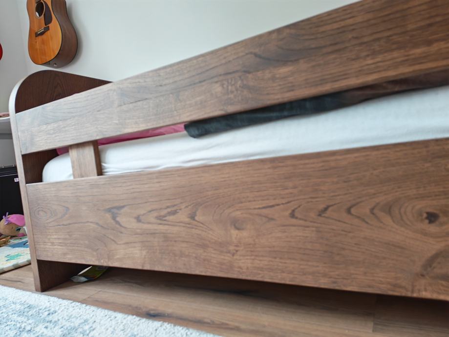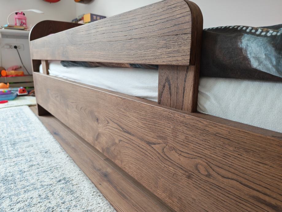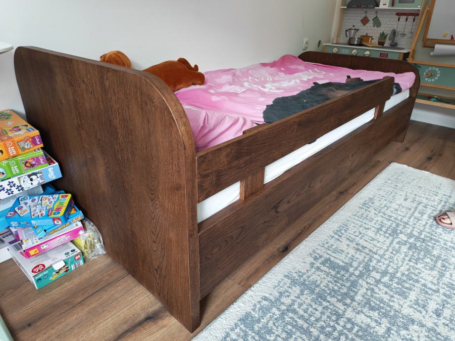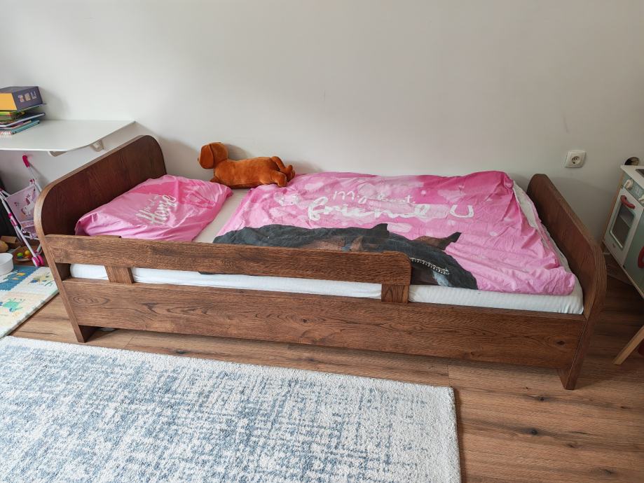 Krevet je dječiji ali može biti i za odrasle ako se ukloni ogradica. Krevet dolazi sa podnicom i madracem. Dimenzija kreveta je 90x200 cm. Krevet je izrađen od furniranog iverala te je lakiran. Na krevetu nikad nije spavano.