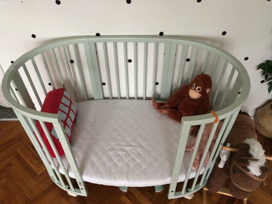 Krevetić je u odličnom stanju sa dva potpuno nova madraca (mini do 6 mjeseci i veći do 36 mjeseci).