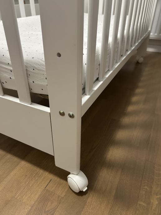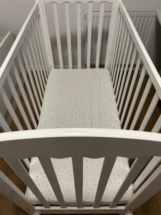 Prodajem bijeli, dobro očuvani krevetić za bebe, standardnih dimenzija 120 x 60 cm, s podlogom podesivom po visini i stranicom koja se jednostavno spušta/podiže na tri razine. Ima bijele kotačiće koji se mogu zakočiti.