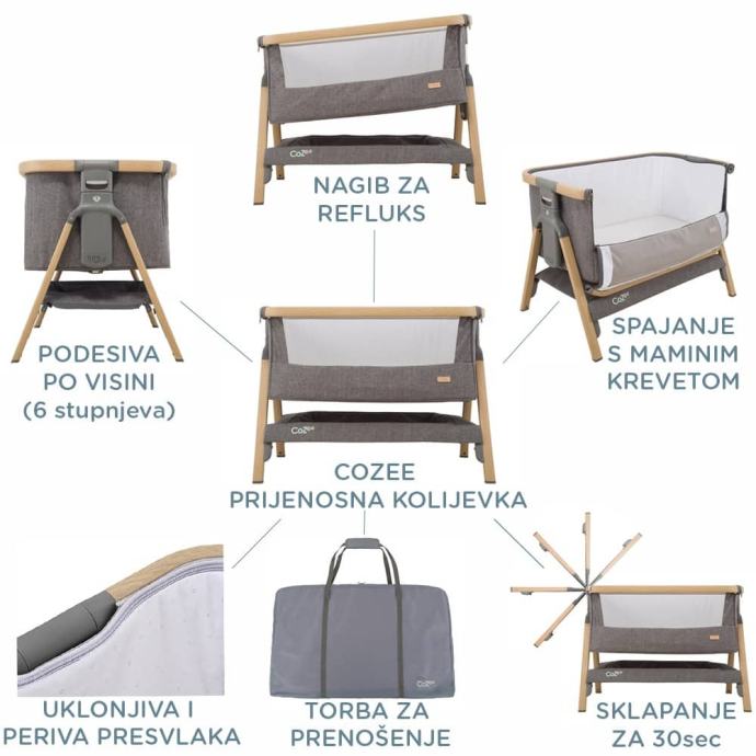 CoZee je prijenosna kolijevka i krevetić koji se može koristiti pokraj majčinog kreveta ili kao zaseban krevetić. Stara je samo 6 mjeseci, oprana i dezinficirana, očuvana kao nova + madrac + originalna kutija.