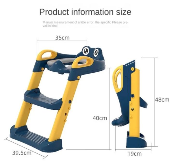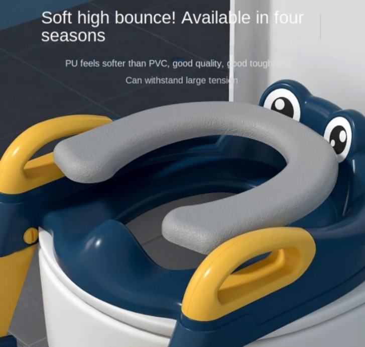 Prodajem nov dječiji adapter za WC školjku sa stepenicama, u plavoj i žutoj boji s veselim dizajnom u obliku žabice. Sjedalo ima mekanu PU podlogu koja je ugodna za sjedenje, a sa strane se nalaze ručke za oslonac. Stepenice su podesive na dvije visine, prva na 15 cm i druga na 22 cm, što omogućuje prilagodbu rastu djeteta. Adapter odgovara WC školjkama visine do 40 cm.