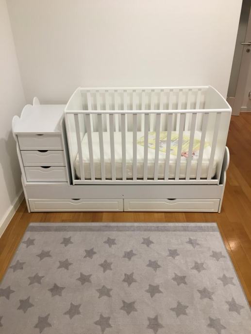 Dječiji krevetić 3u1 bez tragova korištenja sa anatomskim madracem. Korišten svega dva mjeseca,od tada mladi gospodin spava sa roditeljima.