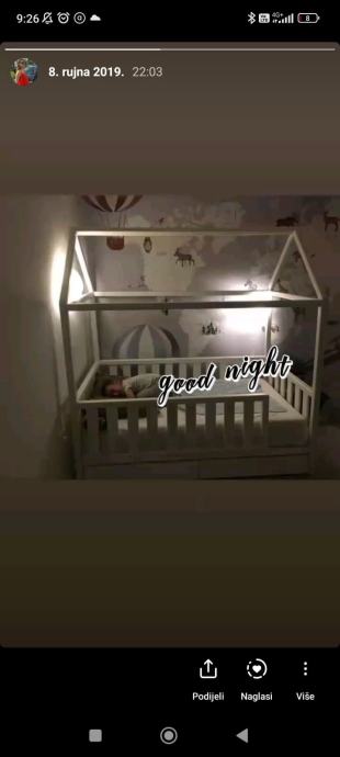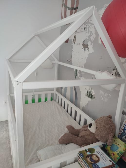 na prodaju je lijepi dječji krevet sa konstrukcijom krova kuće, rađen po narudžbi od drveta lipe, obojan u bijelu bijelu na bazi vode, zdravije zbog djece. Na jednoj stranici kreveta ima napravljen uži izlaz.