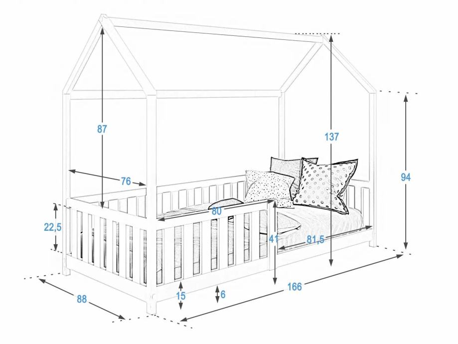 Drvena konstrukcija - Izrađen od punog borovog drveta, krevet jamči dugogodišnju dugotrajnost i stabilnost . Njegov oblik nije samo lijep ukras u dječjoj sobi, već osigurava ugodan i zdrav san vašeg mališana.
