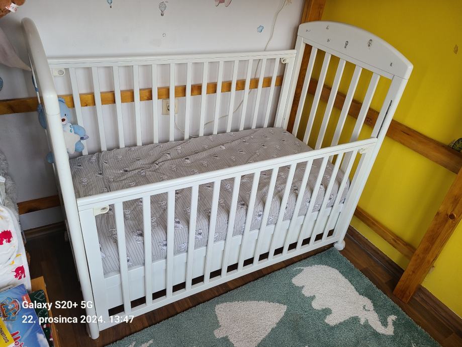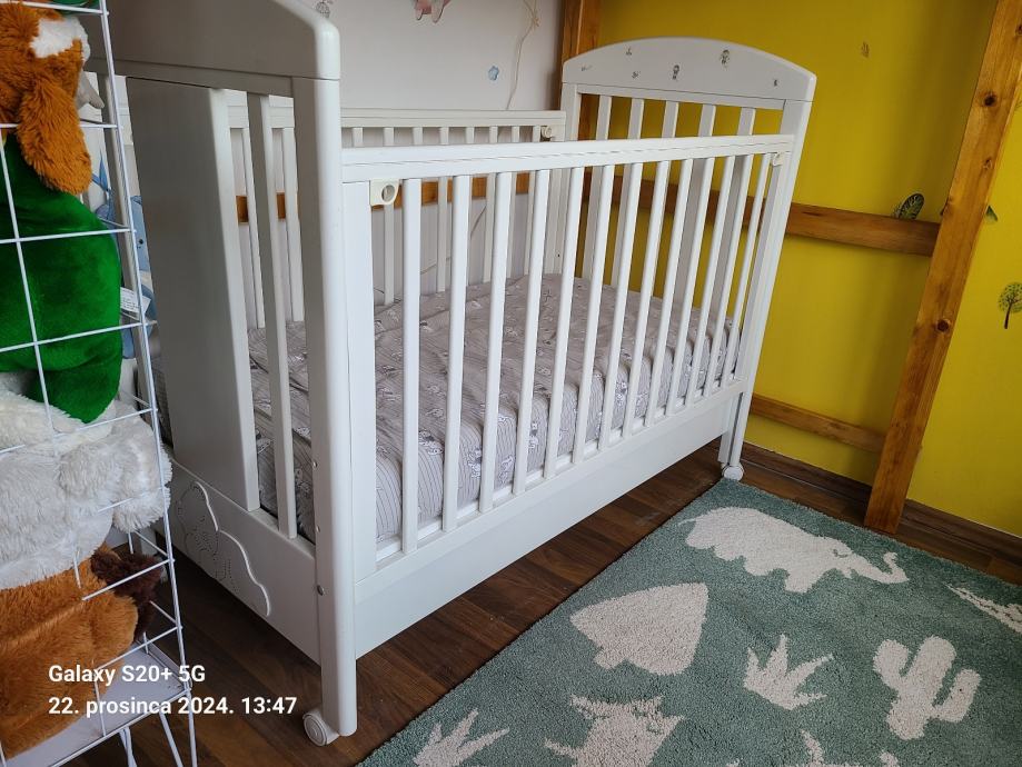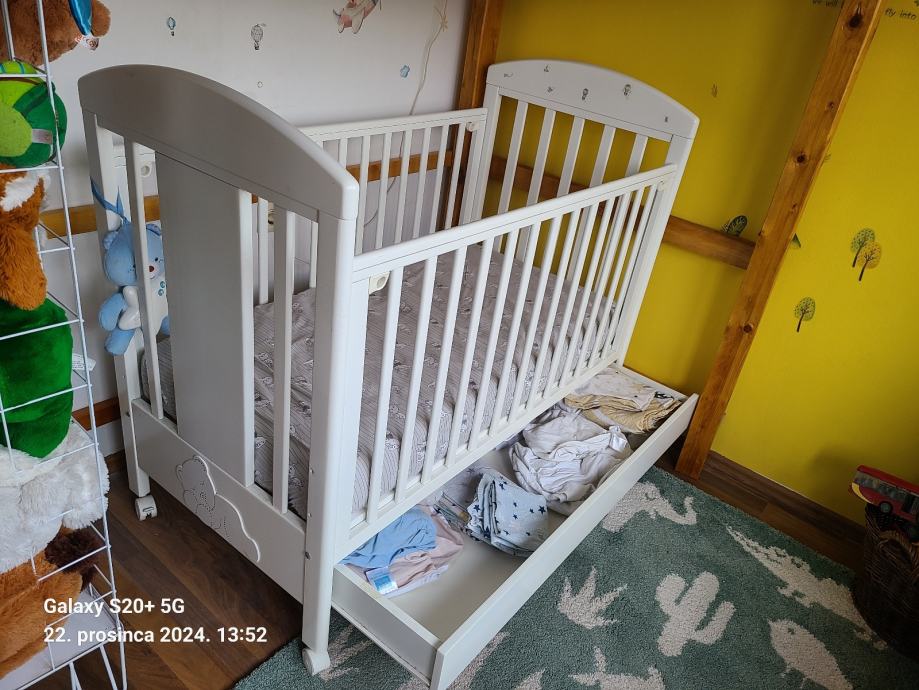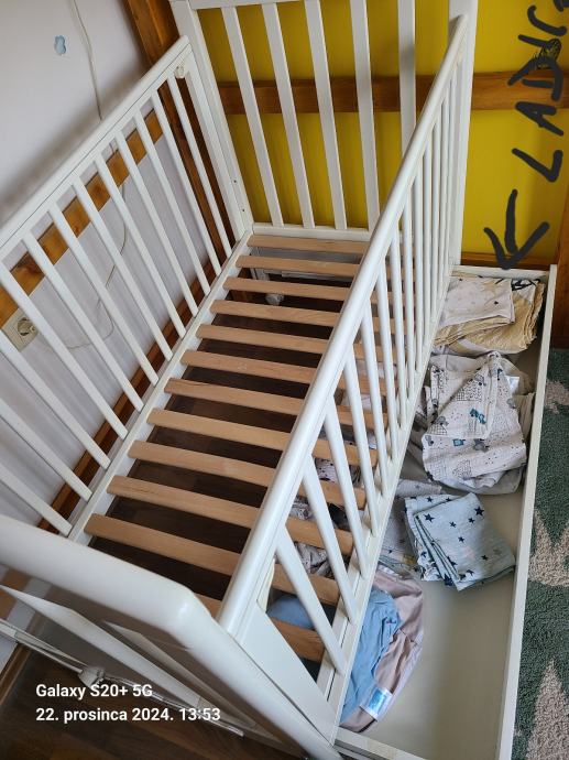 Prodaje se kao nov djecji krevetic. Obje stranice se mogu spustati na 3 razlicite razine (ili do poda). Ispod krevetica je velika ladica za rezervnu posteljinu. Krevet ima drvene podnice i 4 kotacica, koji se mogu zakociti, sto olaksava pomicanje (primjerice ljeti u klimatiziranu sobu i sl).