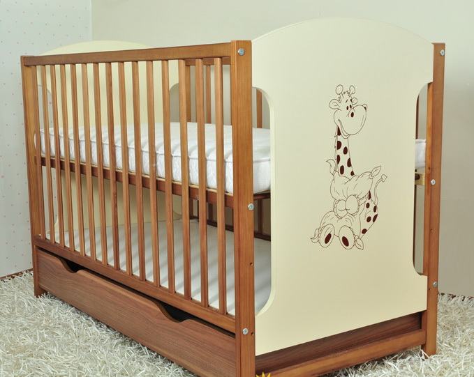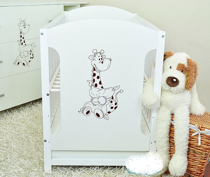 Sa obje strane slika žirafe, visina madraca se regulira na tri visine kako dijete raste, tri šipke koje se miču da dijete kasnije može samo izaći van.Podna ladica za bebi potrepštine