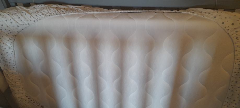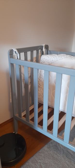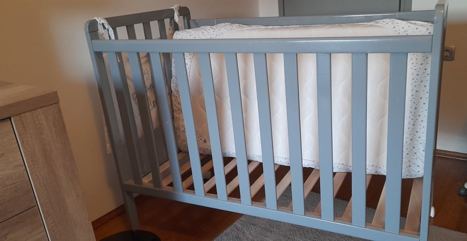 Ktevetic je sive boje, nije korišten. Ima kotače i podnica podesiva na 2 nivoa . Dimenzije duž 124 cm, širina 67 cm. Može uz njega i madrac ali se plaća odvojeno.