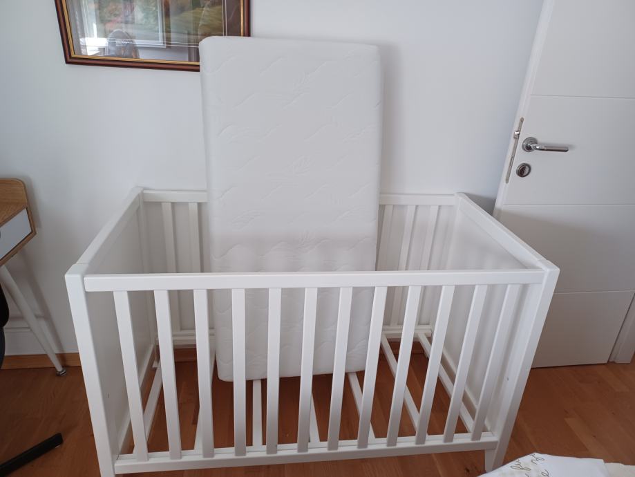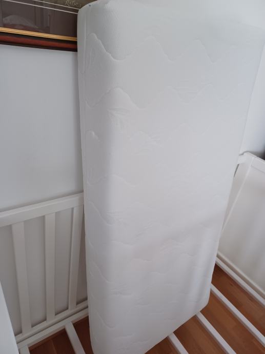 Bijeli dječji krevetić (drvo) s pravim madracom, uščuvan. Dimenzije krevetića 130x65, madraca 120x60.
