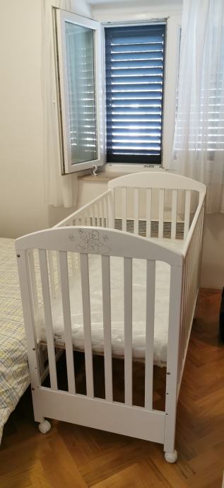 Dječji krevetić s madracem 60×120. Moguće korištenje na 3 načina uz podešavanje visine i skidanje jedne stranice. S ladicom za pohranu. Očuvan. Vidljivi tragovi korištenja.