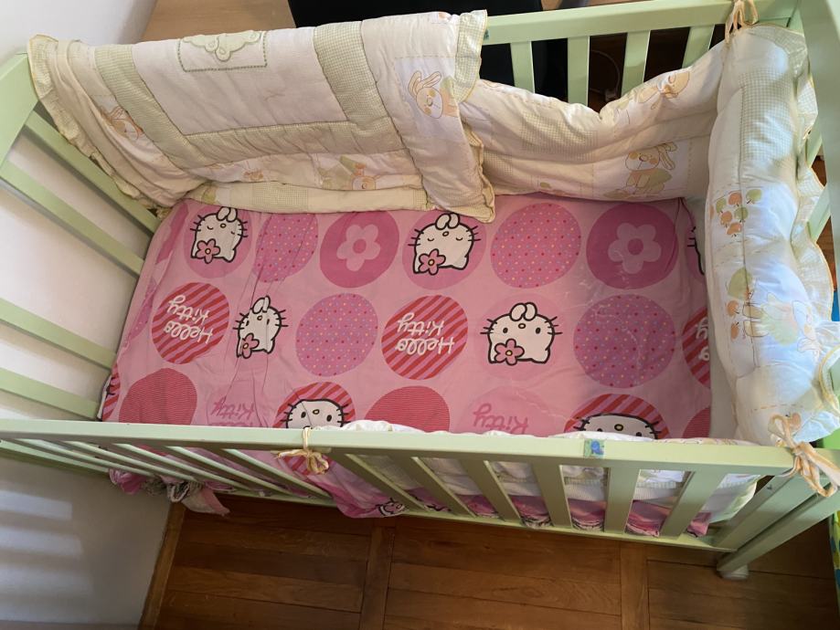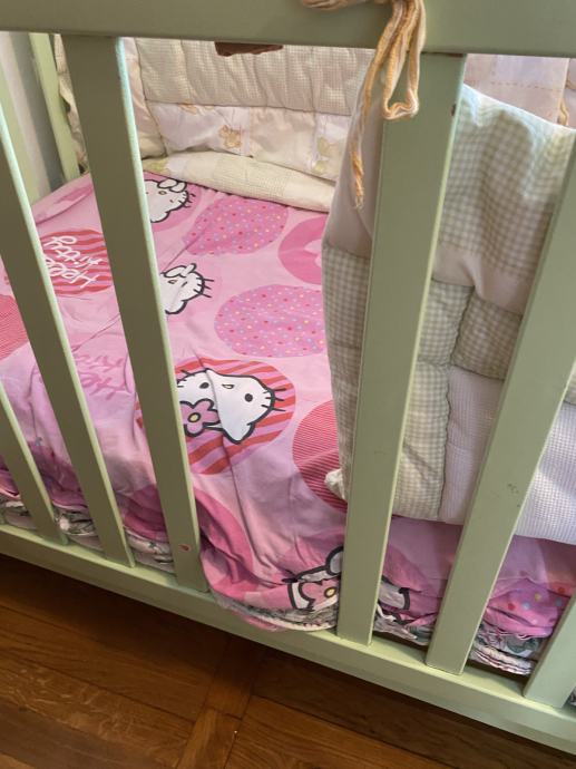 Drveni krevetić. Treba popraviti jednu daščicu u ogradi i nedostaje jedan kotačić. Ostalo je u dobrom stanju.