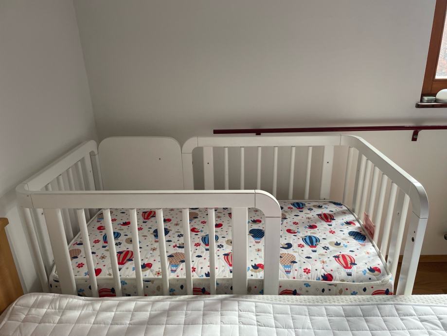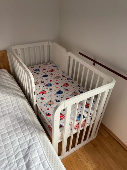 Evolvie bijeli djecji krevetic - hrvatski dizajn, puno drvo, predivno izgleda u prostoru, treba promjeniti pantu na vratascima, ostalo bez ostecenja. Moguce 3 razine podnice (na slici srednja razina).