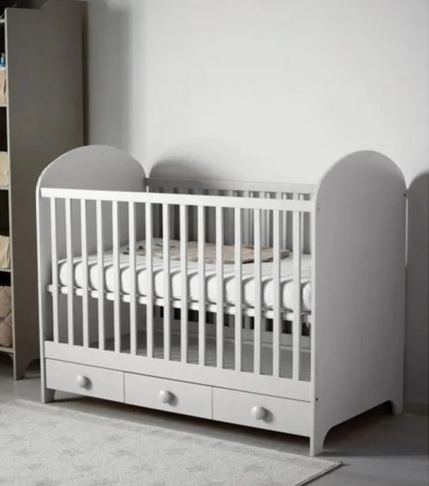 Krevetić je dimenzija 120x60cm, sive boje, s tri ladice i površinom za spavanje koja se može spustiti (viši položaj za novorođenče i niži položaj kad dijete krene stajati).