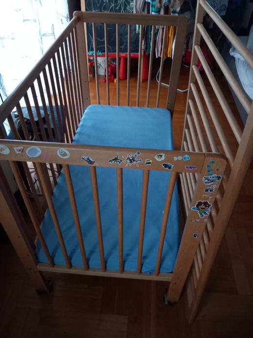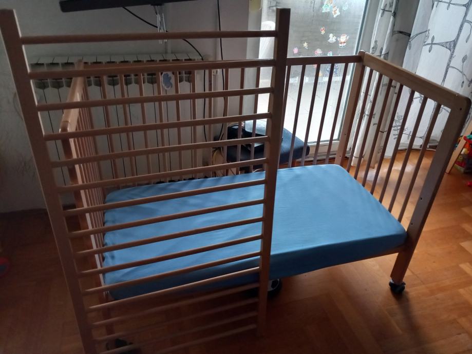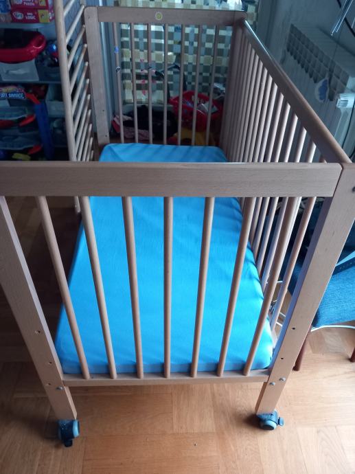 Podnica krevetića se može postaviti na 3 različite visine i jedna stranica skroz maknuti ukoliko je potrebno (tako je i slikan). Uključen IKEA madrac i navlaka, nekoliko setova posteljine i nepropusna podloga. Mi smo sami montirali kotačiće (nisu uključeni).