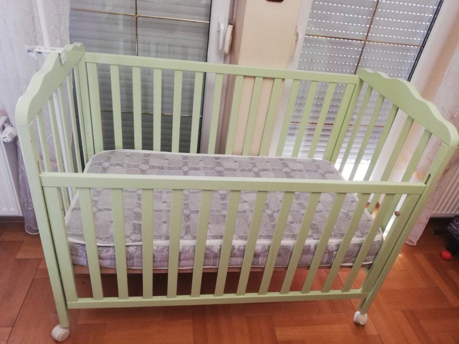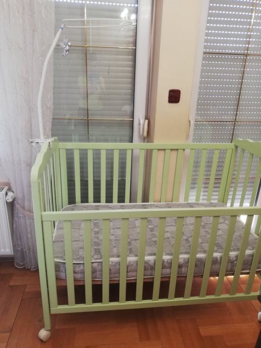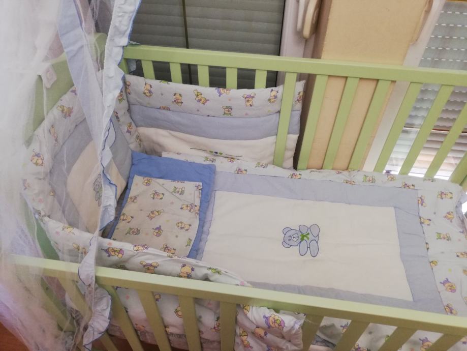 Kinderbet s ladicom za posteljinu+madrac i podnica+posteljina+baldehin i stalak za baldehin. Malo korišten, 1 god.