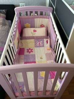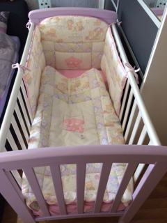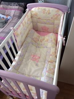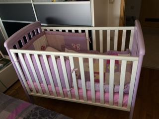 Prodajem savršeno očuvani kinderbet, boja: bijela+ nježno ljubičasta, dimenzija 120x60 sa pomičom bočnom stranicom.