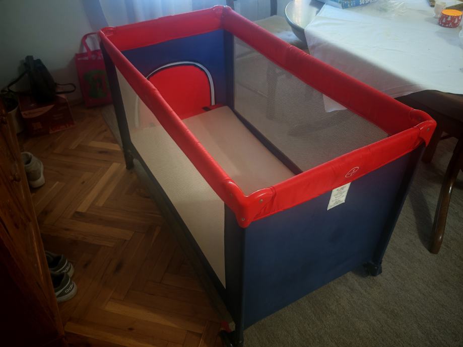 Putni krevetić (vrtić) za bebe marke Mondo Tuo, kratko korišten, ima dva kotača s jedne strane radi lakseg pomicanja. Praktičan je i rasklopiv. Uz krevetić dolazi madrac. Dimenzije 120x60x60.
