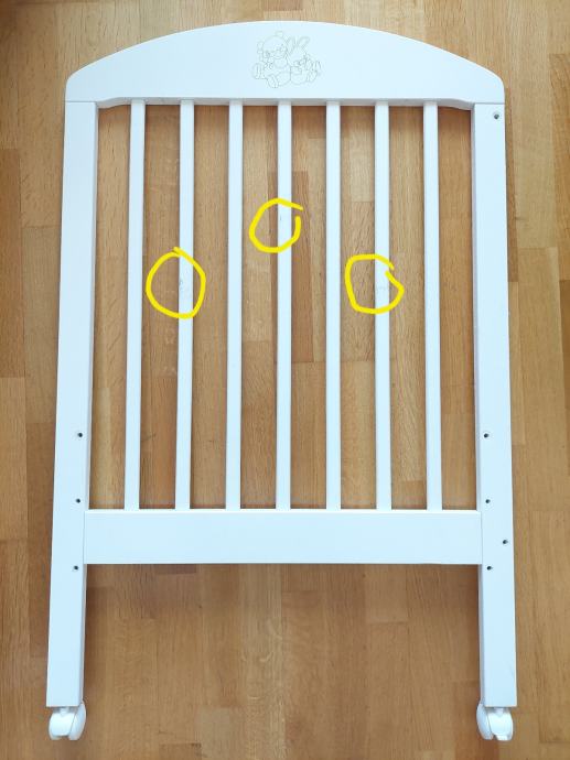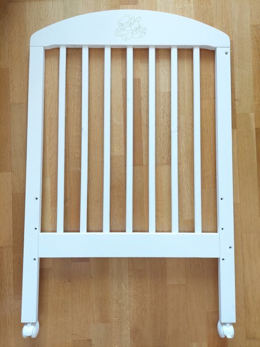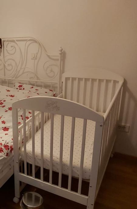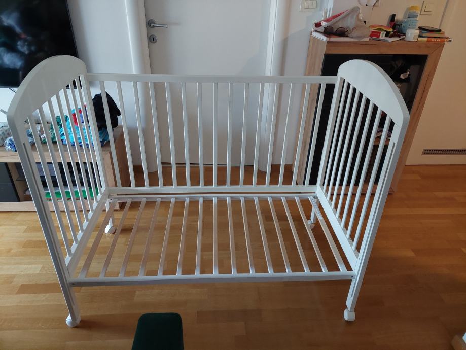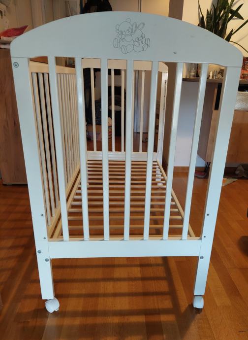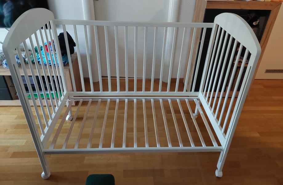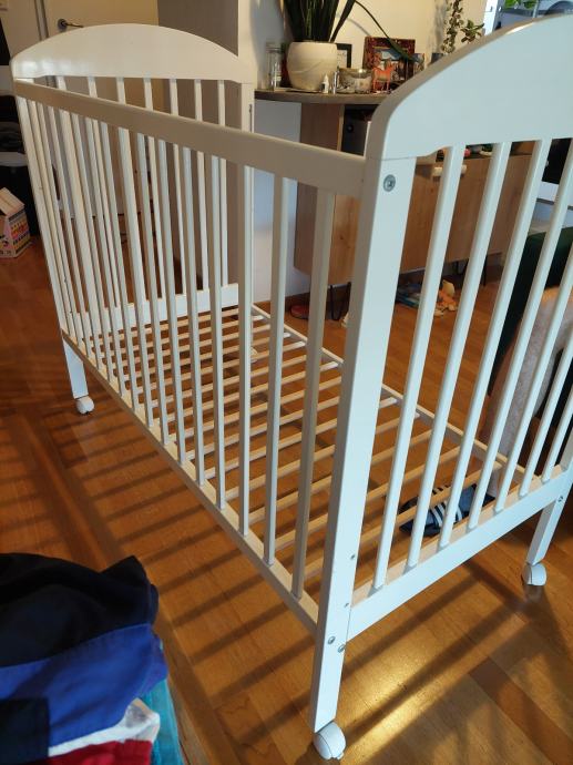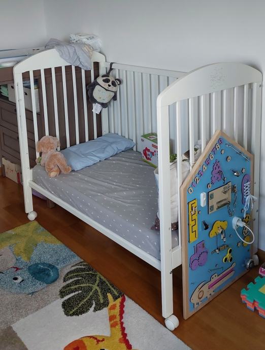 Krevetić na kotačiće, drveni, bijeli, dimenzija cca 120×60. Jedna stranica je pomična pa se može spuštati ili skroz maknuti kad je dijete veće. Isto tako se podnice mogu podići (3 razine). Ovisno o poziciji krevetića u sobi bočne stranice s letvicama su zgodne jer je kroz njih lakše vidjeti bebu nego kad su pune stranice. Super očuvan, jedino je bijela boja malo oštećena na jednoj bočnoj stranici kao što se vidi na zadnjoj slici jer je tu bila pričvršćena senzorička ploča za igru.