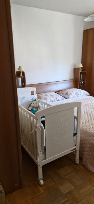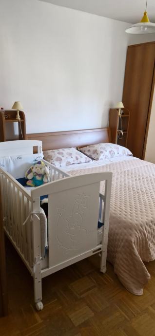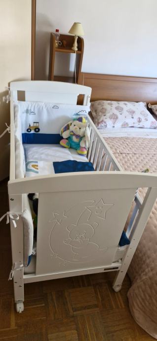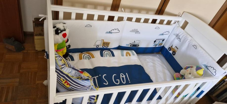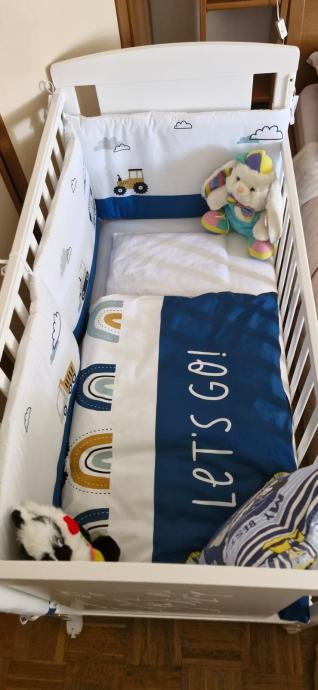 Potpuno nov krevetić za bebe s posteljinom, novi madrac, zaštitna podloga preko madraca, zaštita oko krevetića, bijele boje, drvo, nema donju ladicu