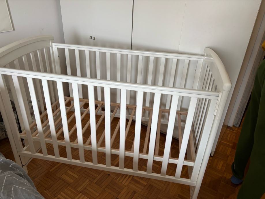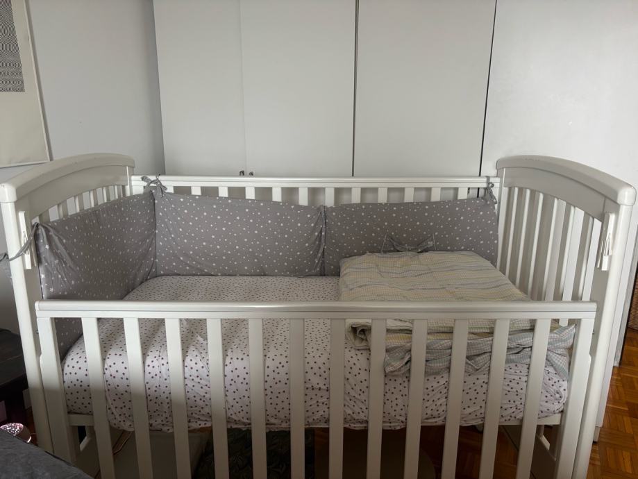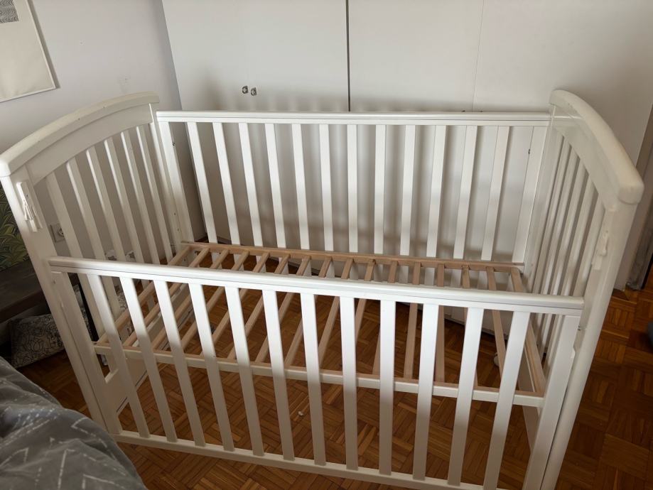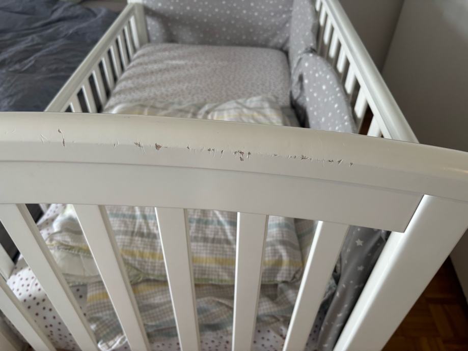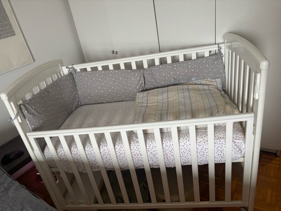 Prodajem dječji krevetić bijele boje s letvičastim dnom. Krevetic je na kotačiće koji imaju i mogućnost kočenja. Jedna stranica se može spustiti pa krevetić može biti kao side by side. Takodjer madrac i podnica imaju tri razine u koje se mogu spuštati kako dijete raste. Manja oštećenja boje su od kvačice na kojoj je bila kamera za dijete. U cijenu je uključeno sve što je potrebno za spavanje: madrac, poplun, jastuk i posteljina iz IKEE te zaštitna mekana ograda. Komplet je potpun i spreman za korištenje.