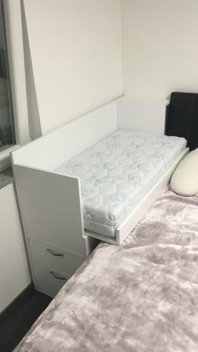 Prodajem krevetić (next to me), rađen po mjeri za sobu gdje nema dovoljno mjesta. Korišten od strane jednog djeteta 9 mjeseci. Nema nikakvih oštećenja. Ima dvije ladice te se stranica može podignuti za odlaganje stvari. Krevetić je rastavljen. Dimenzije za madrac su 120x60cm. Cijena je 150€.