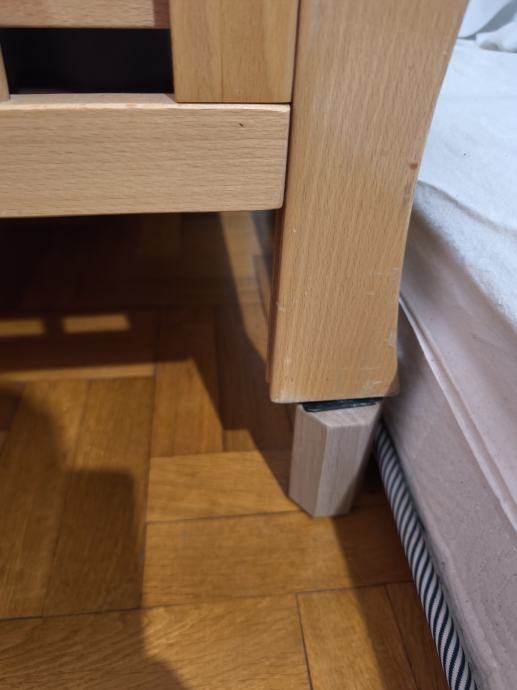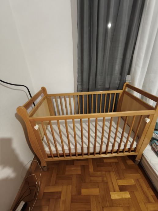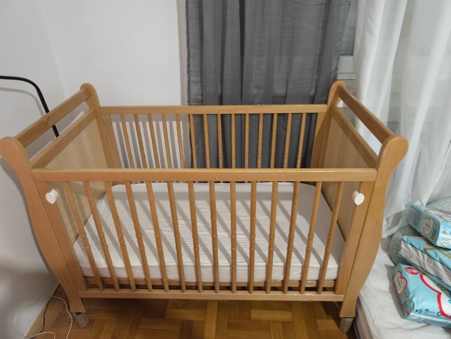 Krevetić s mogućnošću spuštanja jedne strane ogradice. Noge su naknadno montirane. Madrac uključen.