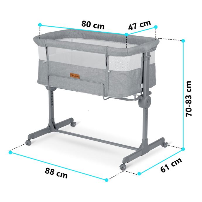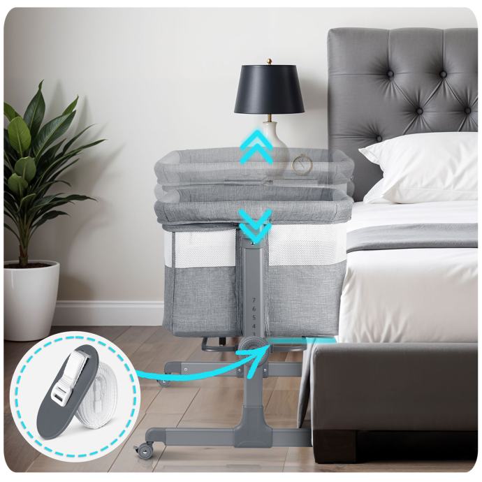 Bočni krevetić ima neovisno podešavanje visine s obje strane, što omogućuje prilagodbu razini kreveta roditelja i osigurava udobnost i za bebu i za roditelje.
