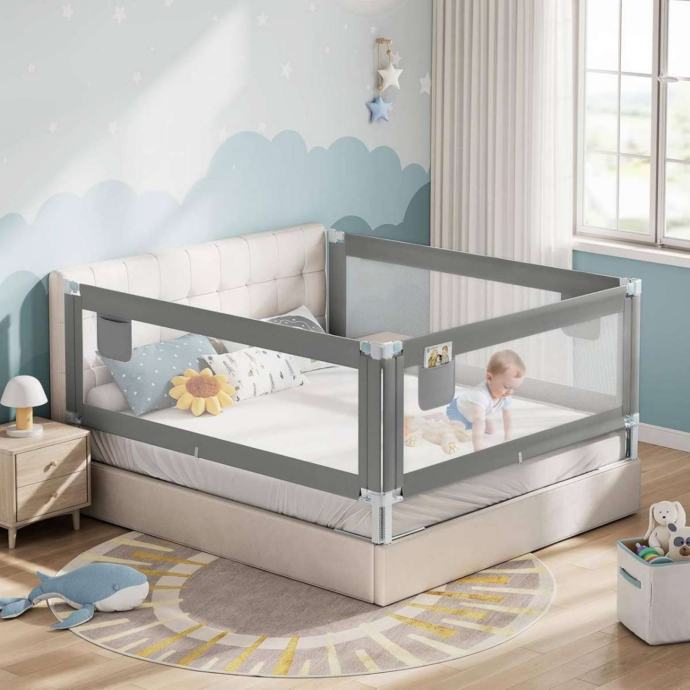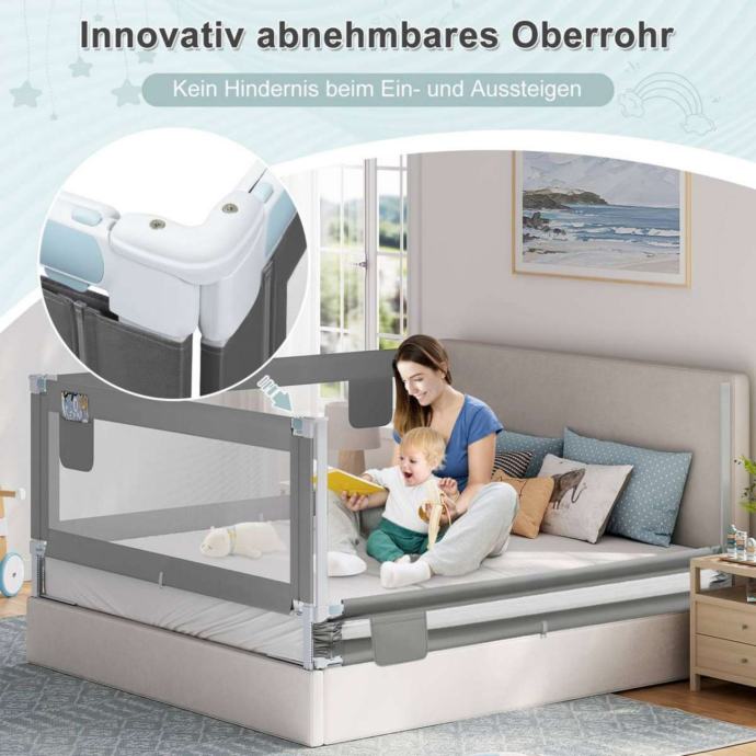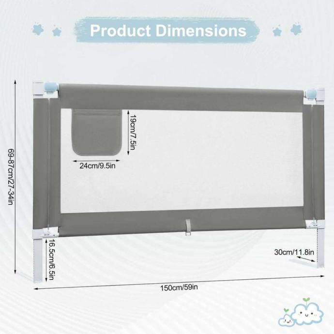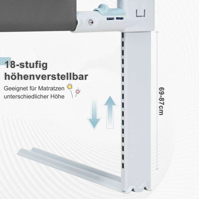 PODESIVA VISINA: Zaštita od pada prikladna je za većinu kreveta (duljine 150, 180 i 200 cm). Ovisno o debljini madraca, može se podesiti u 18 položaja između 69 i 87 cm. Preporučena debljina madraca je 5-30 cm.