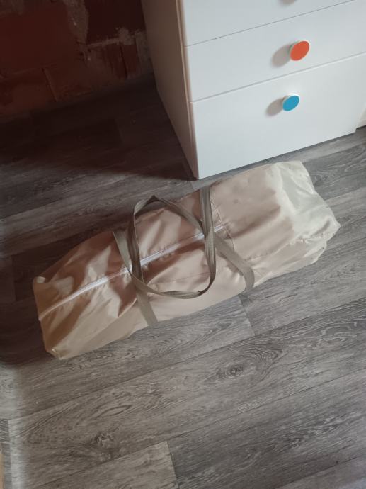 Otprilike ovakav sličan kao na slici je krevetić putni bež boje, stabilan, u dobrom stanju, spremljenih u torbu koja je dio opreme.