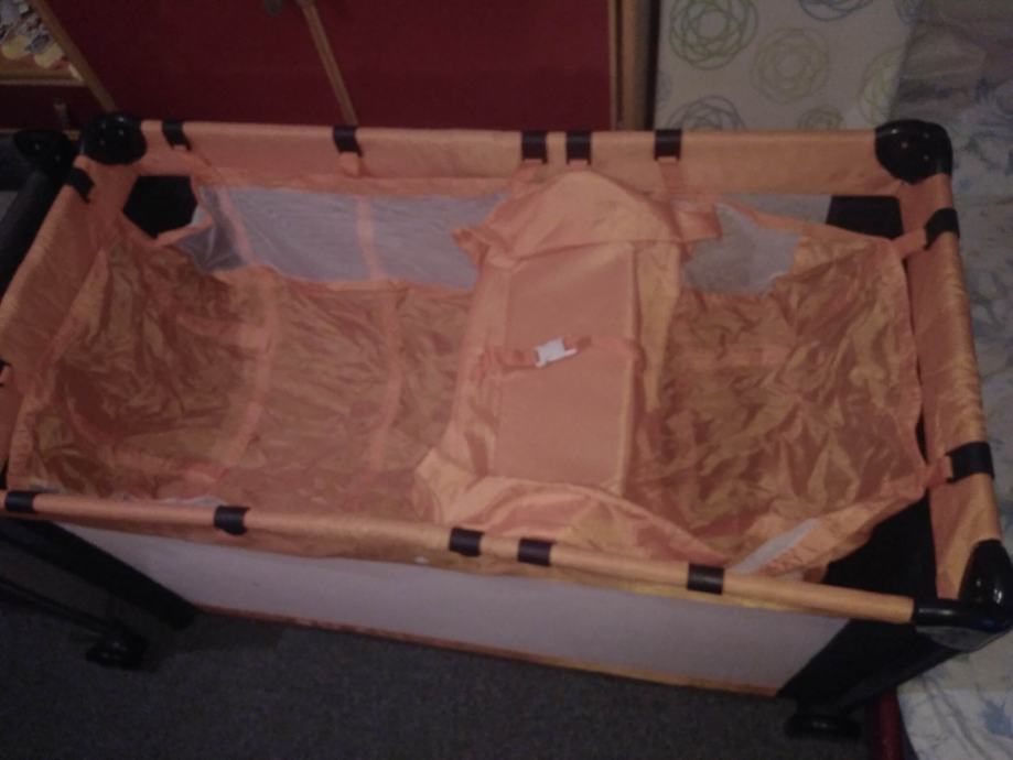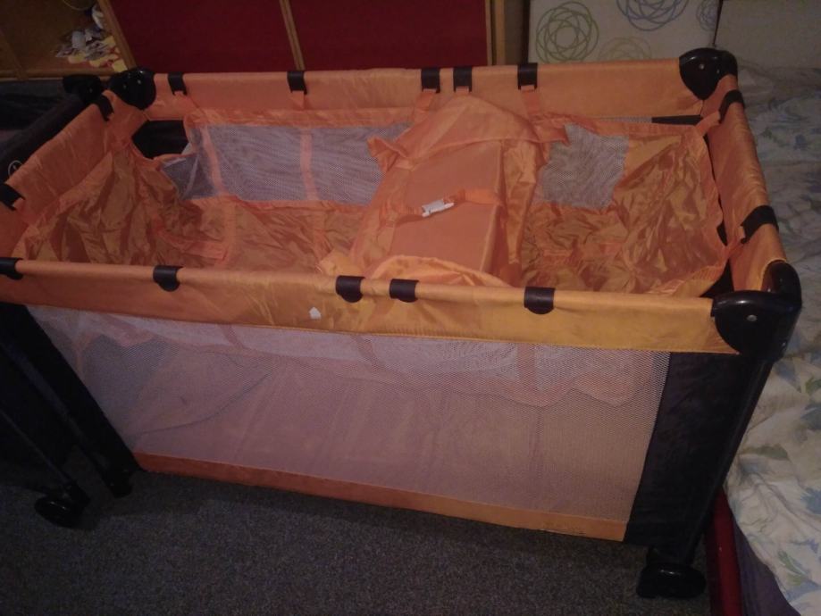 Putni sklopivi krevetić, 60x120 cm, uključivo madrac. Na 2 nivoa. U odličnom stanju. Narandžaste boje. Bočne stranice od prozirne bijele mrežice. Sa bočnim otvorom.