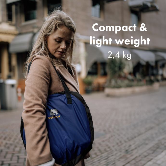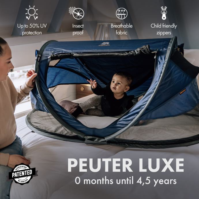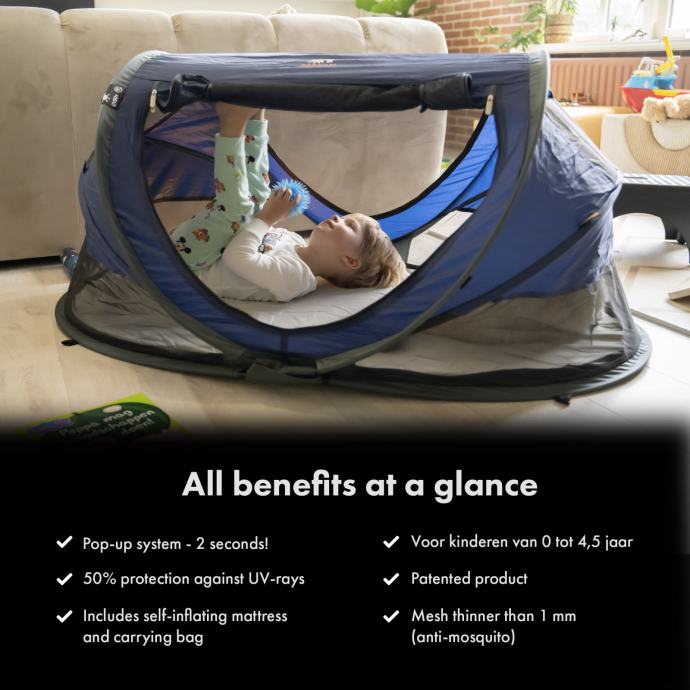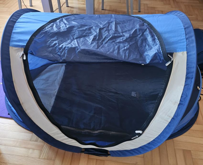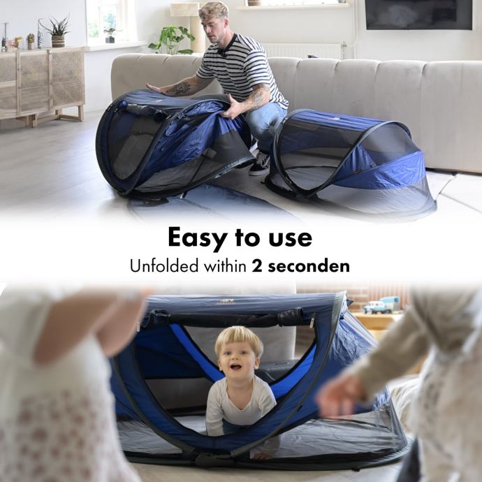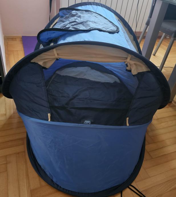 Idealno za putovanja jer ne zauzima prostor, lagano, postavlja se za 2 sekunde. Može se koristiti kao putni krevetić u zatvorenom ili kao šator na otvorenom. UV zaštita, zaštitna mreža protiv insekata, zatvara se cifovima.