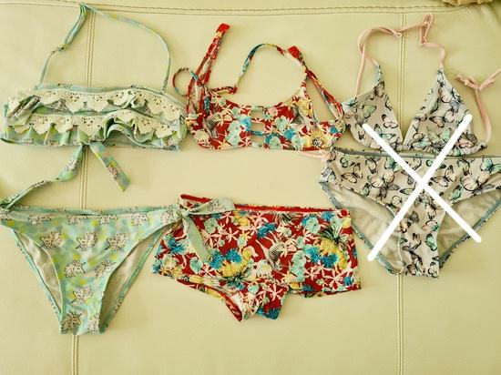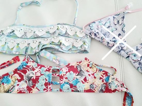 Dva dvodijelna kupaća kostima za djevojčice, odgovaraju veličini 134/140. Lijevi na jednoroge, kupljen u butiku s talijanskom robom,ima čipku i bisere na gornjem dijelu. Lagano podstavljen, no to se može i izvaditi. Crveni na zebrice kupljen u Tezenisu. Zadnji na slici prodan. Dva badića zajedno za samo 5 eura.