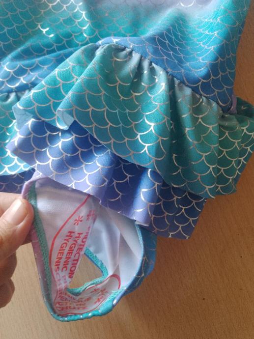 Novi jednodijelni prekrasni kupaći kostim s etiketom za djevojčice , uzorak ljuskica , blago gliterasti, veličina piše 6-8 godina. Po meni za veličinu 122 . Ima higijensku naljepnicu na dnu. Nije korišten, kao što se vidi na slici. Može biti i kao dres za ples ili ritmiku . Prodajem za 8 eura + pt.
