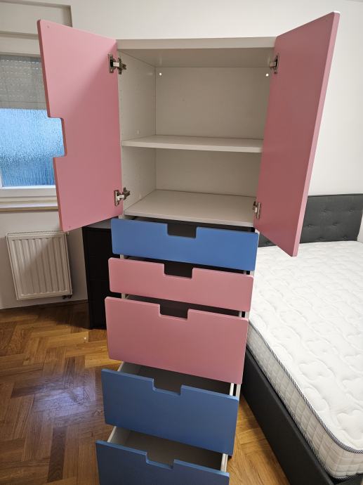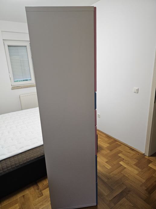 Dječji ormar iz IKEA-e, star 7,8 godina, potpuno očuvan, nama je služio kao spremnik za igračke. Dvije velike police, dvije male ladice i tri velike ladice. Dimenzije ormara su 193cm visina, 60cm širina, 51cm dubina.
