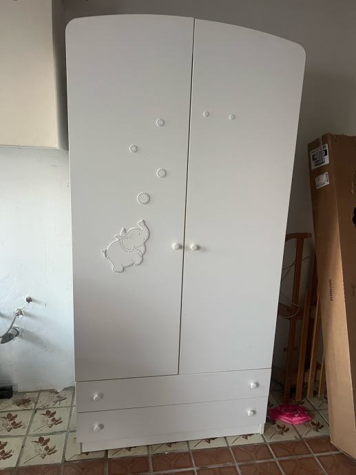 Prodajem dječji ormar bijele boje s dvokrilnim otvaranjem i dekorativnim 3D motivom slona na vratima. Na dnu ormara nalaze se dvije ladice koje pružaju dodatni prostor za odlaganje. Dobro očuvan.