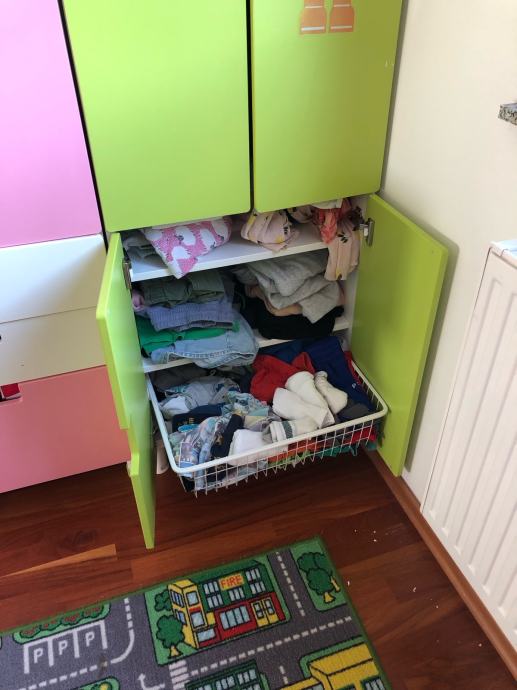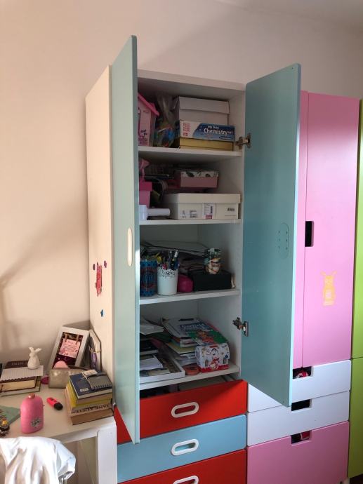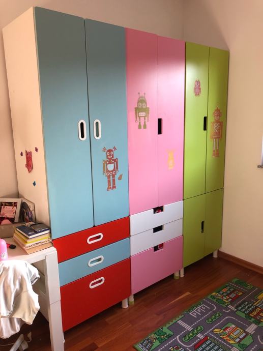 3 dječja ormara IKEA samstad plasta https://www.ikea.com/hr/hr/p/smastad-platsa-ormar-bijela-bijela-s-4-ladice-s99426363/ i dva krevete Ikea Busunge roza i plavi https://www.ikea.com/hr/hr/p/busunge-produljivi-krevet-bijela-70305700/ Cijena ormara 110 EUR i kreveta sa madracima 3 dijela 180 EUR komad