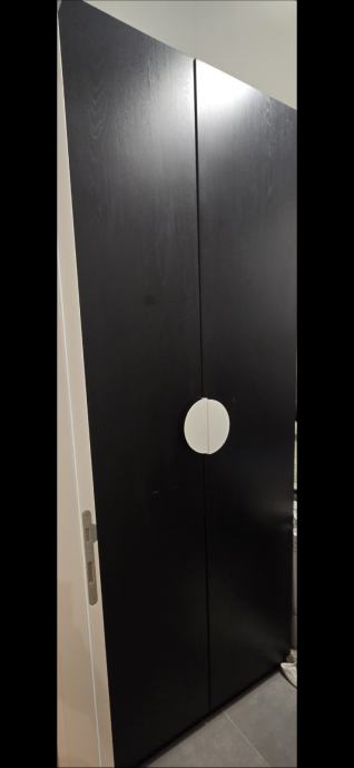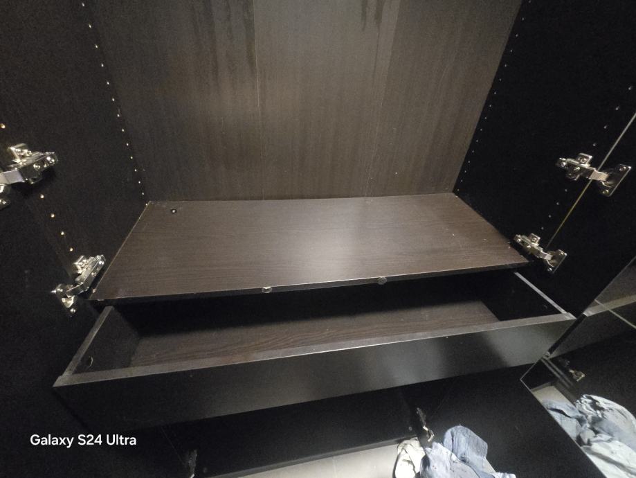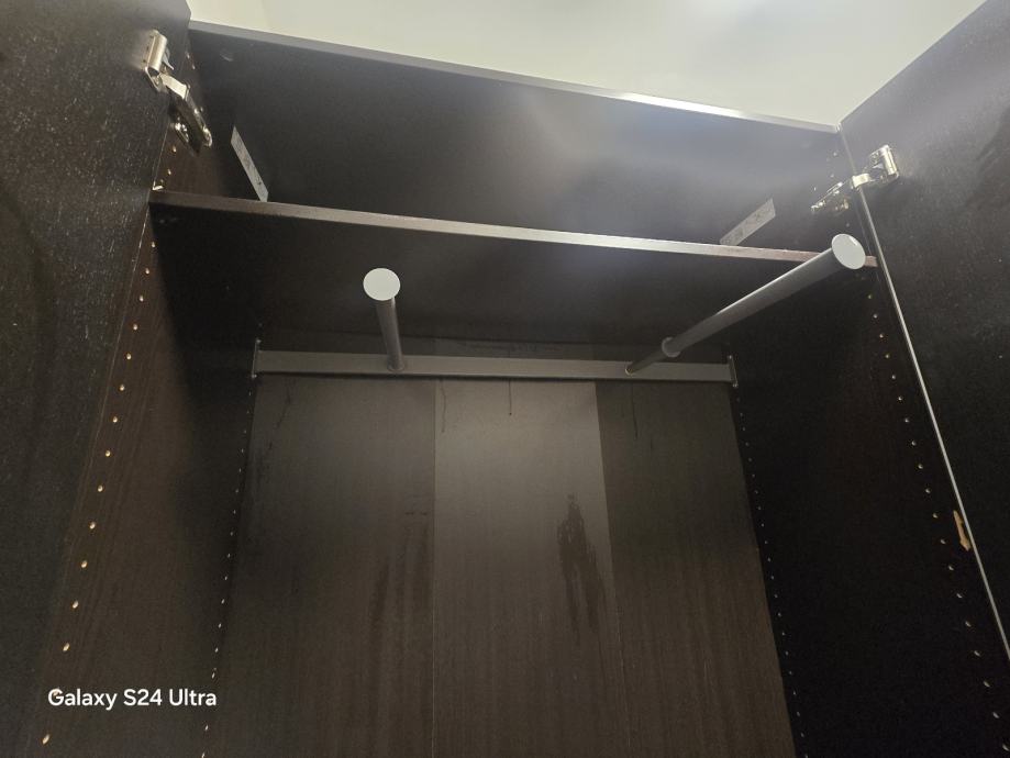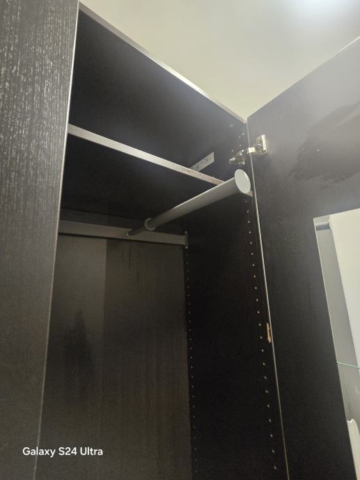 Unutra se nalazi na sredini jedna ladica, jedna polica, 2x vješalice koje se izvlače prema van.