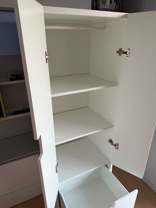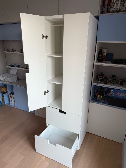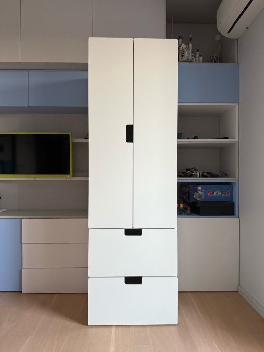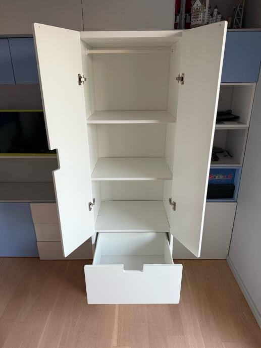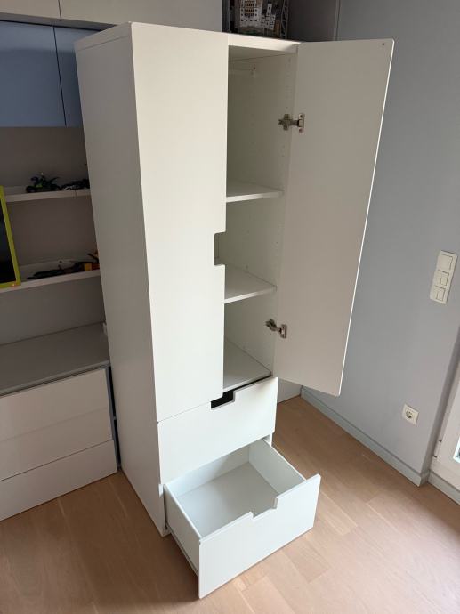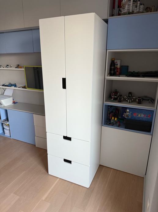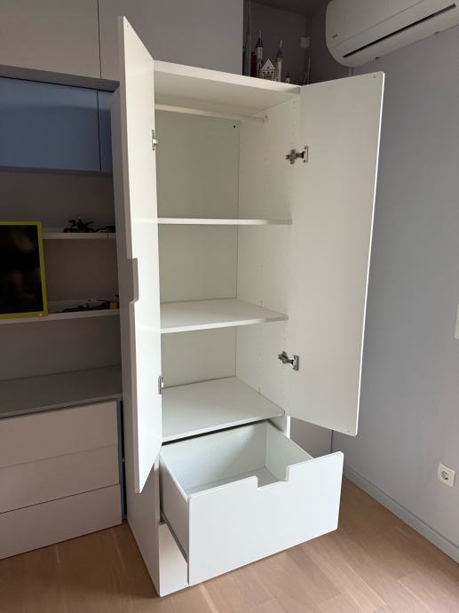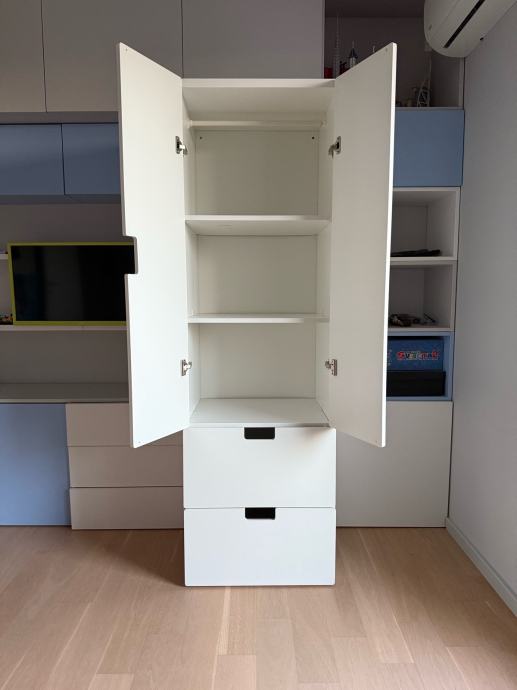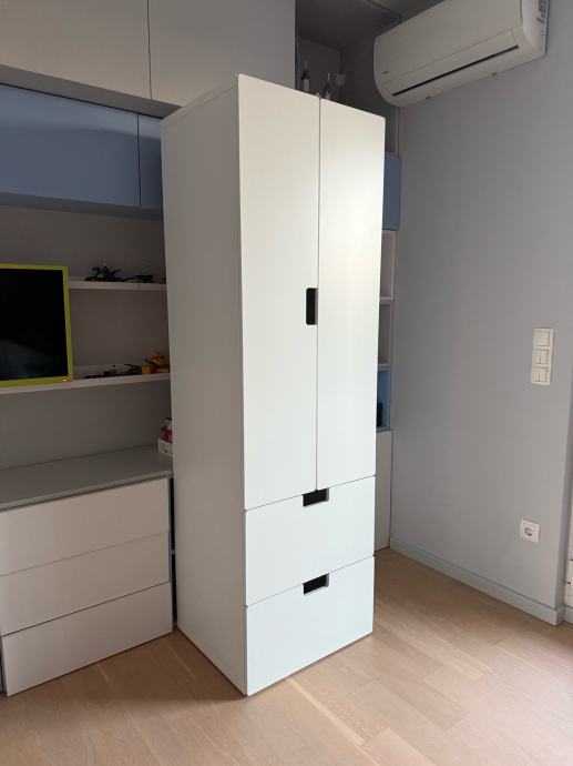 IKEA STUVA ormar bijele boje idealan za dječju sobu. Unutar ormara nalazi se i mjesto za vješalice pa se police mogu izvaditi ukoliko želite objesiti odjeću. U odličnom stanju, bez ikakvih oštećenja, sastoji se od dva ormarića s vratima i dvije prostrane ladice – odličan za spremanje odjeće, igračaka i školskog pribora. Moderan i funkcionalan dizajn koji se lako uklapa u svaki prostor.