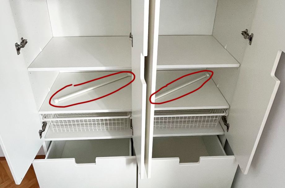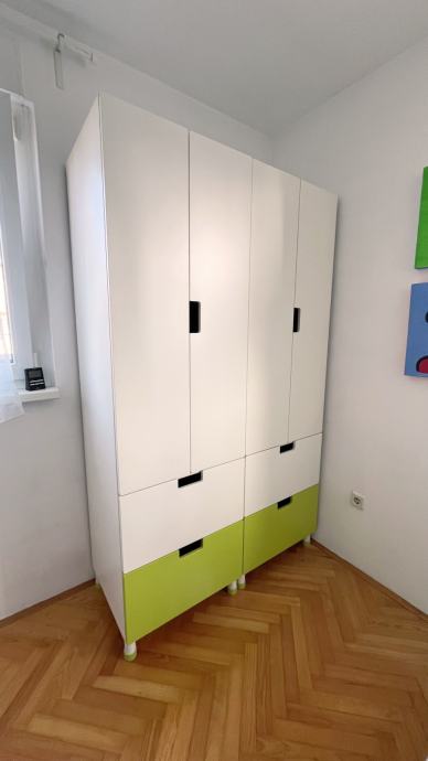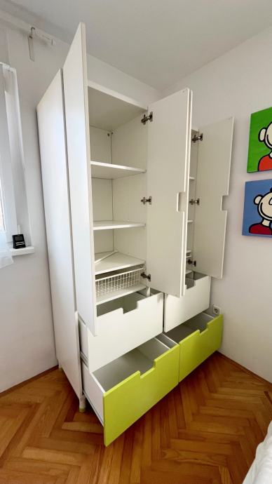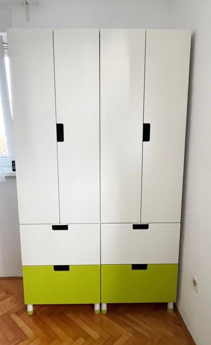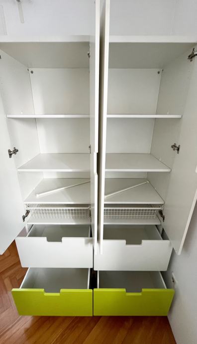 Prodajem 2 ormara IKEA STUVA. Ormari su rabljeni, ali u odličnom stanju, neoštećeni. Naknadno su kupljene košare i dodatne police, a postoje i šipke za vješanje odjeće (zaokruženo crvenom bojom na slici) za oba ormara tako da možete urediti unutrašnjost kako vama odgovara.