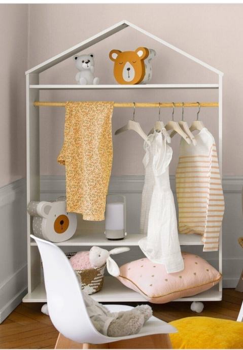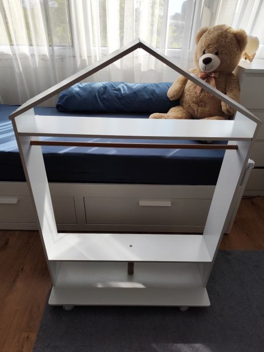 Otvoreni ormar/garderoba na kotačima izrađen je u skladu s Montessori filozofijom koja potiče istraživanje pa uz ovaj komad namještaja djeca mogu lako dohvatiti svoju odjeću, igračke i druge osobne stvari, razvijajući tako osjećaj samostalnosti i odgovornosti.