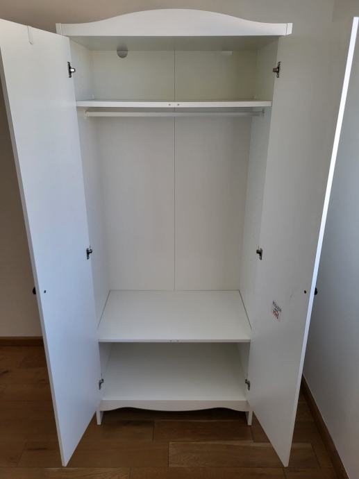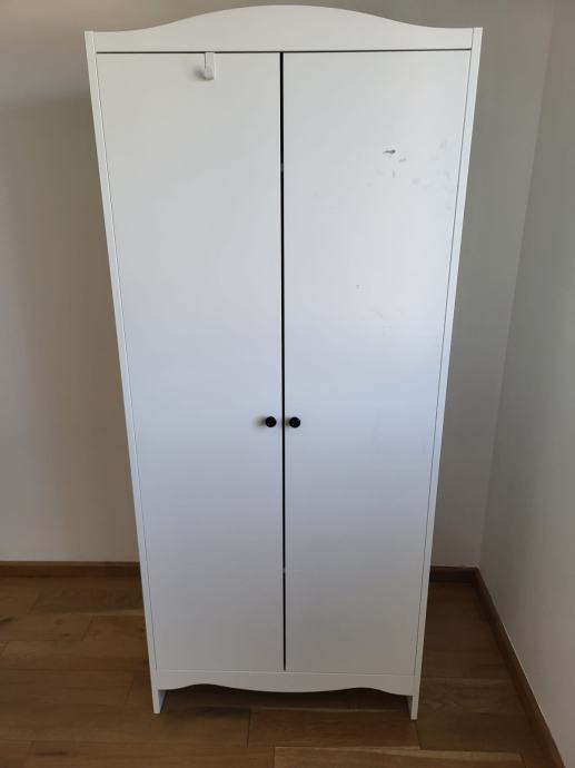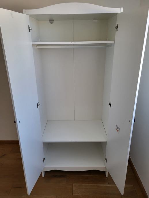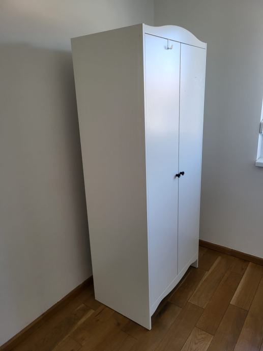 Prodajem dječji ormar kupljen u Ikei. Ormar potpuno ispravan s manjim oštećenjem laka od skidanja naljepnica (vidljivo na fotografijama). Max. dimenzije ormara 80 (širina) x 187 (visina) x 50 (dubina) cm.