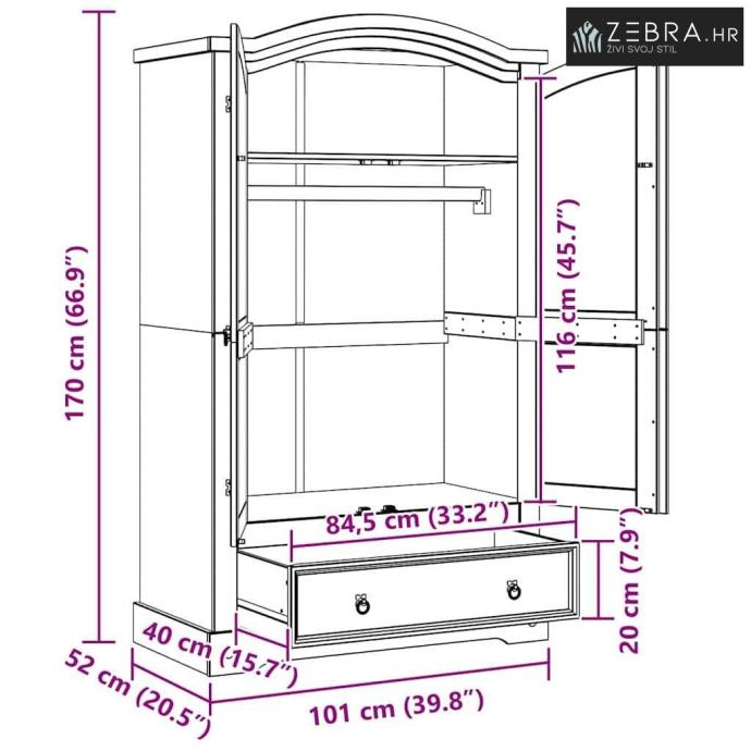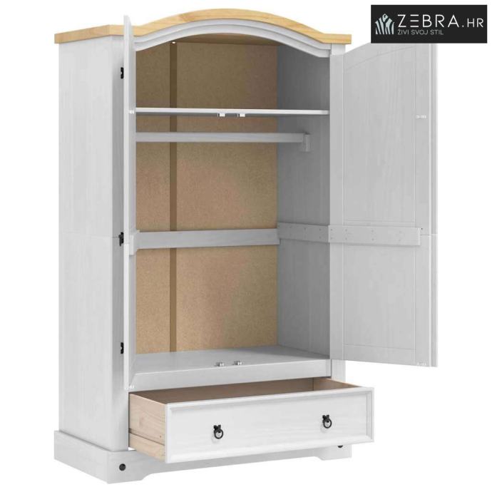 Masivna borovina: Glavna konstrukcija garderobera je od masivne borovine koja osigurava čvrstoću i stabilnost. Ova prirodna tekstura dodaje toplinu i rustikalni ugođaj tvom prostoru, savršeno se uklapajući u sve vrste interijera, a dugotrajnost je zagarantirana za svakodnevnu upotrebu.