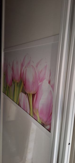 Garderobni iveral visoki sjaj ormari ( KOM 2 ) sa kvalitetnim aluminijskim kliznim vratima. Na jednom ormaru su dezeni ruža i bijelog dezena, a na drugom čisto bijela ispuna.