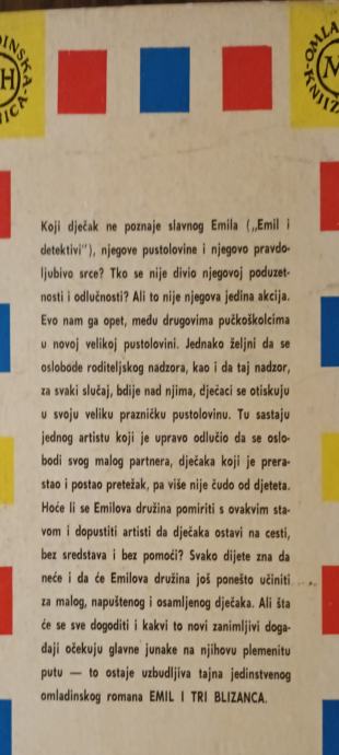 Klasik literature za mlade - Erich Kaestner: Emil i tri blizanca. Izdanje Matice hrvatske, Zagreb, 1965. Na hrptu rukom napisan naziv knjige.