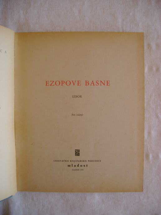 Ezopove basne - Biblioteka Vjeverica, izdavač Mladost, Zagreb 1978. godine, 17 x 21 cm, tvrdi uvez, 177 stranica.