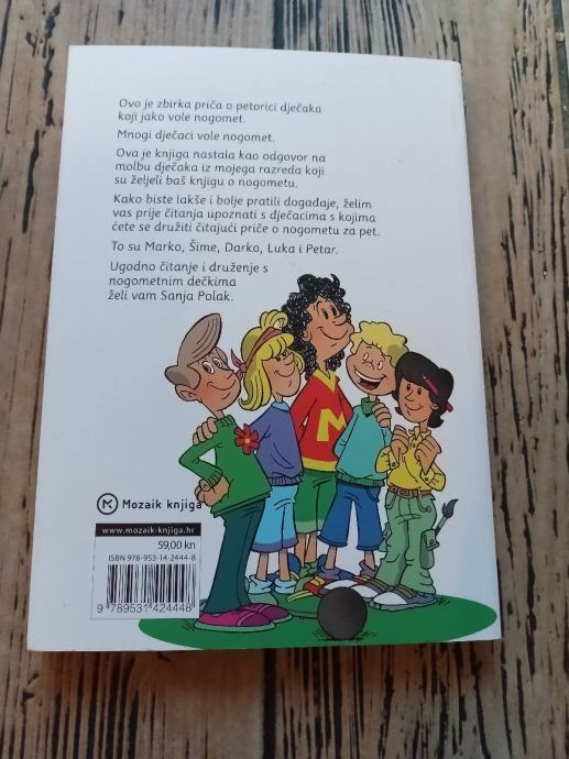 Nogomet za pet uzbudljiva je zbirka priča Sanje Polak koje će oduševiti mlade ljubitelje nogometa. Čitajte o zgodama i nezgodama petorice dječaka – Marka, Šime, Darka, Luke i Petra – prijatelja koji jako vole igrati nogomet.