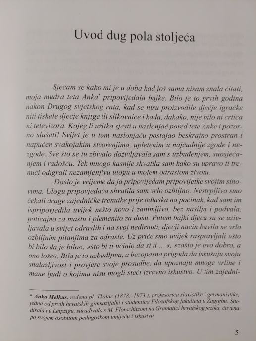 Prekrasne priče s poukama koje je autorici pričala njena teta, prof. Anka Melkus, čuvena po pedagoškom umijeću nadahnute su čežnjom za jednim boljim, svijetom dobrih ljudi. Kroz pripovijetke »Starinske priče«, djeca na bezopasan način mogu iskušati svoju snalažljivost i provjeriti svoje prosudbe, upoznati mnoge vrline i mane ljudi koje još nisu mogli steći izravnim iskustvom. Putem ovih priča djeca mogu uživati u svijetu odraslih i na svoj nedirnuti, dječji način baviti se vrlo ozbiljnim pitanjima za odrasle.