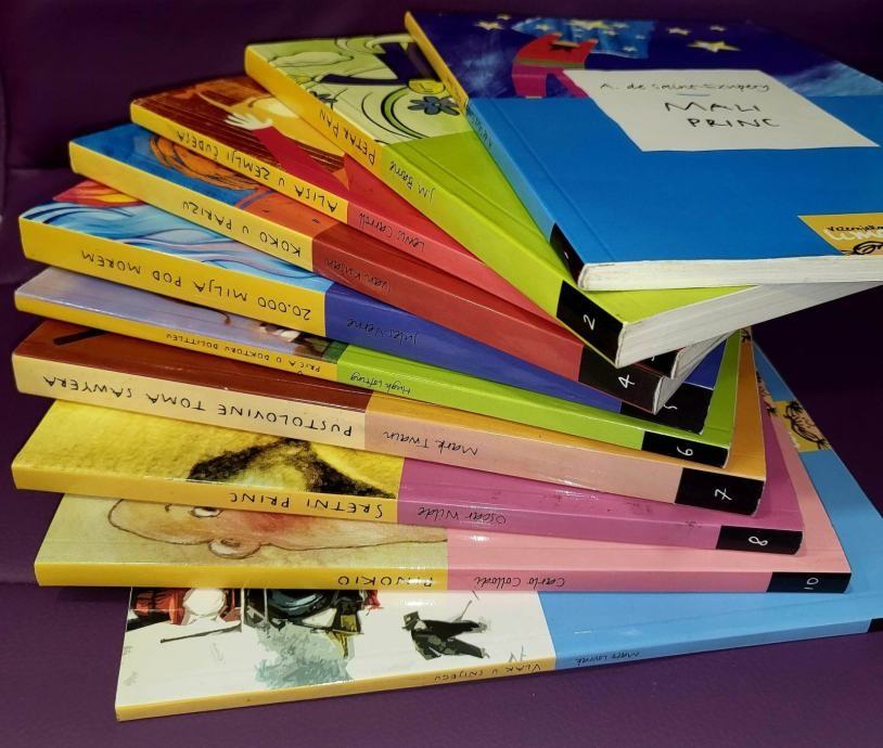 Komplet sadrži: 1. A. de Saint-Exupery - Mali princ 2. J.M. Barrie - Petar Pan 3. Lewis Carroll - Alisa u zemlji čudesa 4. Ivan Kušan - Koko u Parizu 5. Jules Verne - 20000 milja pod morem 6. Hugh Lofting - Priča o doktoru Dollitleu 7. Mark Twain - Pustolovine Toma Sawyera 8. Oscar Wilde - Sretni princ 9. Mato Lovrak - Vlak u snijegu 10. Carlo Collodi - Pinokio