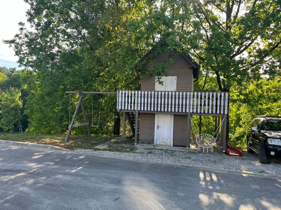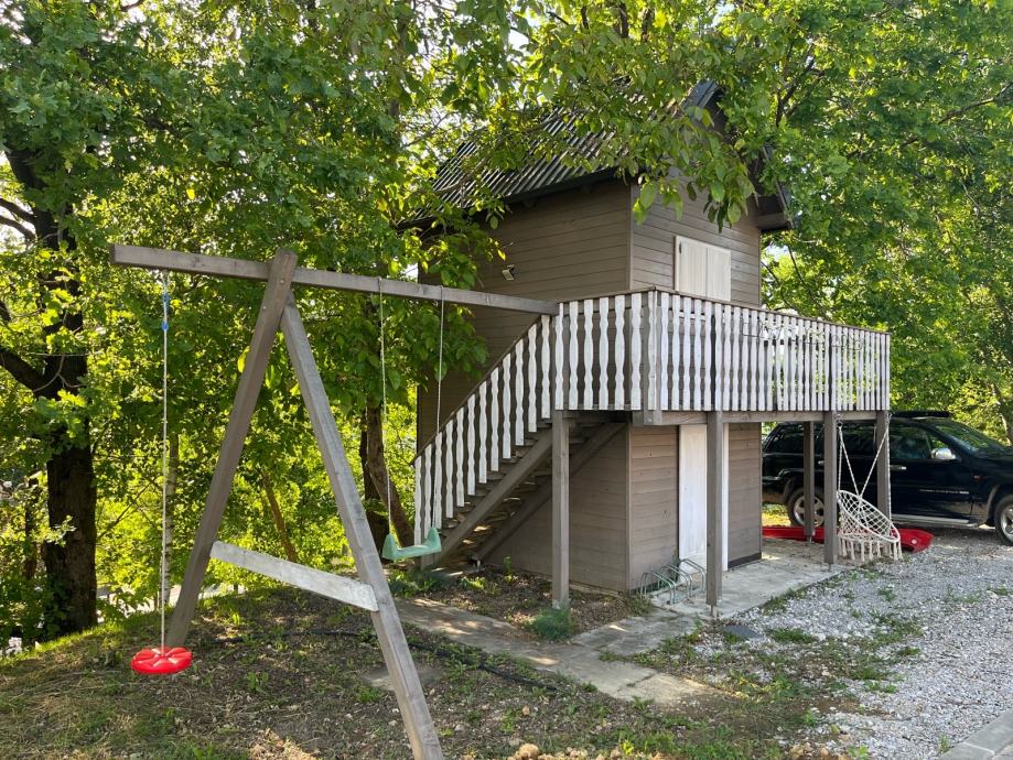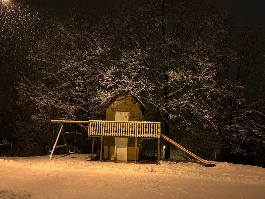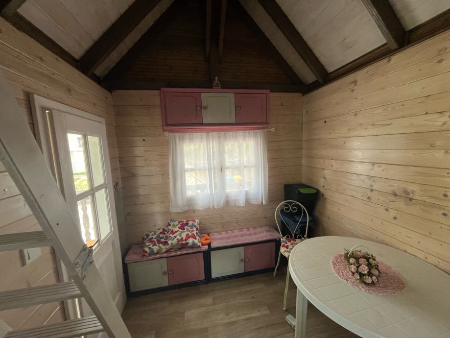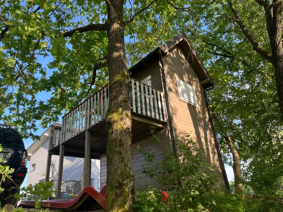 Prodajem drvenu dječju kućicu za igranje sa spremištem, ljuljackom i toboganom (uz nadoplatu, prodaje se zasebno 500€). Kućica tlocrtne dimenzije 400x400cm sa balkonom i terasom, sama kućica 250x320cm, visina 400cm, do Sljemena 550cm. Komplet uređena, sa prozorima, vratima, namještajem. U kućici galerija sa krevetom. Godina izrade 2020. Izuzetno čvrsta i kvalitetno izrađena.