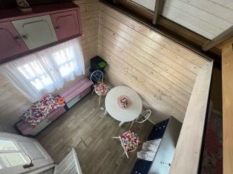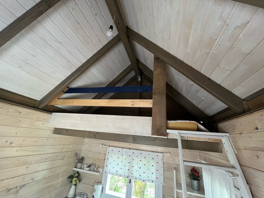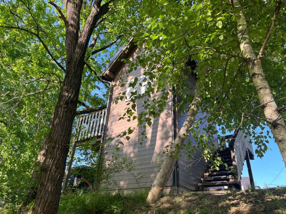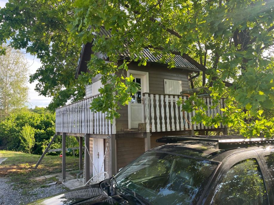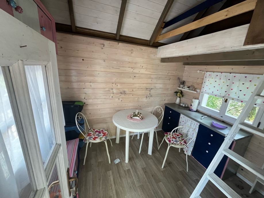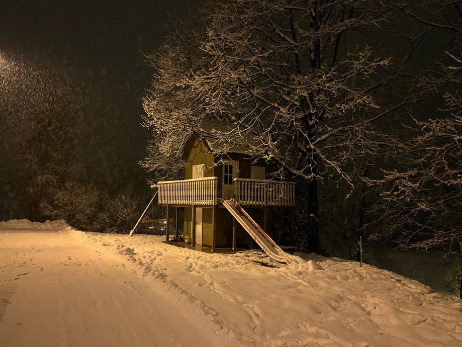 Prodajem drvenu dječju kućicu za igranje sa spremištem, ljuljackom i toboganom (uz nadoplatu, prodaje se zasebno 500€). Kućica tlocrtne dimenzije 400x400cm sa balkonom i terasom, sama kućica 250x320cm, visina 400cm, do Sljemena 550cm. Komplet uređena, sa prozorima, vratima, namještajem. U kućici galerija sa krevetom. Godina izrade 2020. Izuzetno čvrsta i kvalitetno izrađena.