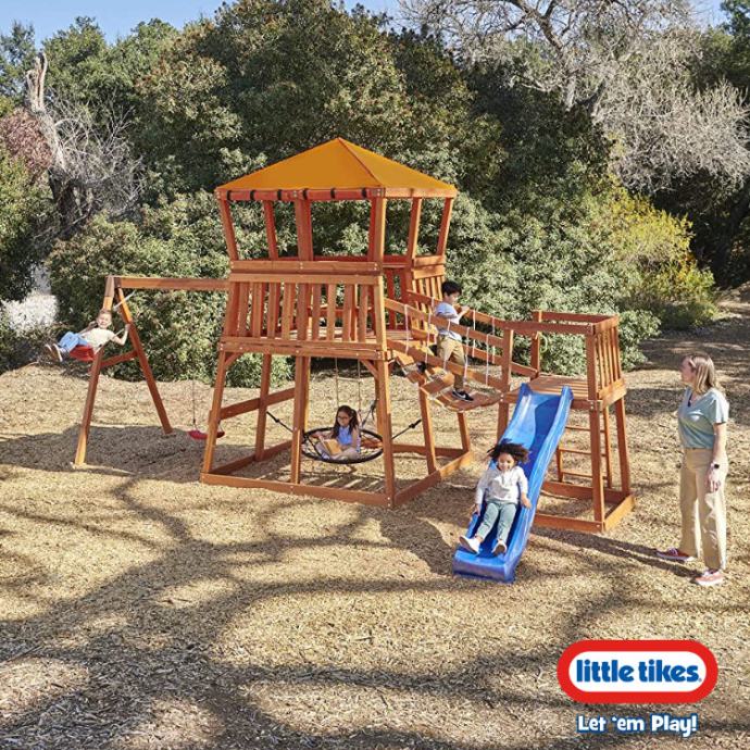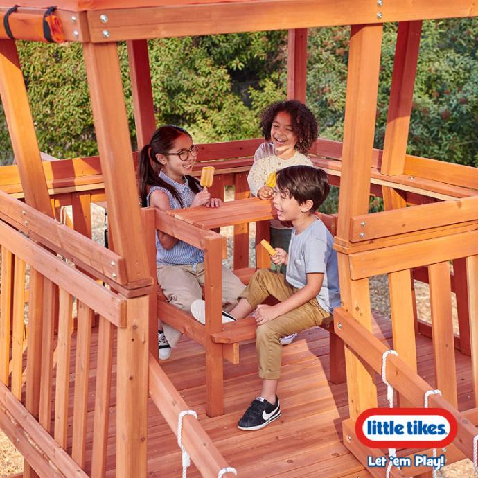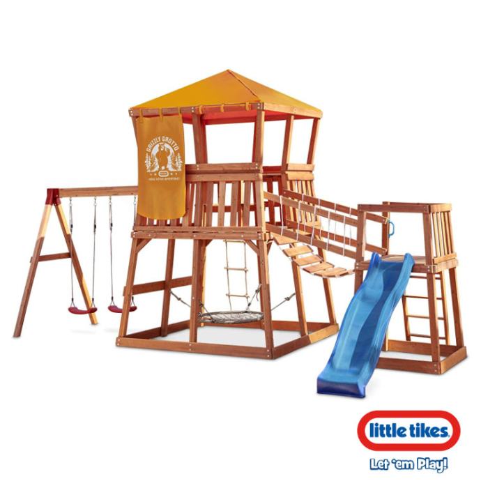 Little Tikes Grizzly Grotto ekskluzivno je drveno dječje igralište za dvorište koje sadrži udobnu drvenu kućicu - bungalov, terasicu s platnenim sjenilom koje je savršeno za kampiranje, promatranje zvijezda i još mnogo toga. Komplet za igru Real Wood Adventures Grizzly Grotto ima prostora za igru do 10 djece odjednom.